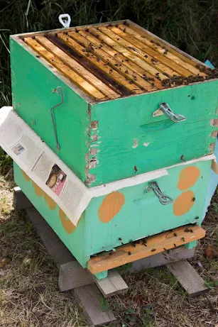 Με ένα αιχμηρό αντικείμενο, δημιουργούμε μικρές τρύπες πάνω στην εφημερίδα, στα σημεία που εφάπτεται με τα κενά που αφήνουν τα πλαίσια. Ξεκουμπώνουμε τον κινητό πάτο της άλλης κυψέλης του αδύνατου μελισσιού και τοποθετούμε το σώμα αυτής, μαζί φυσικά με το καπάκι, πάνω στην πρώτη, κάνοντας το μελίσσι διώροφο.